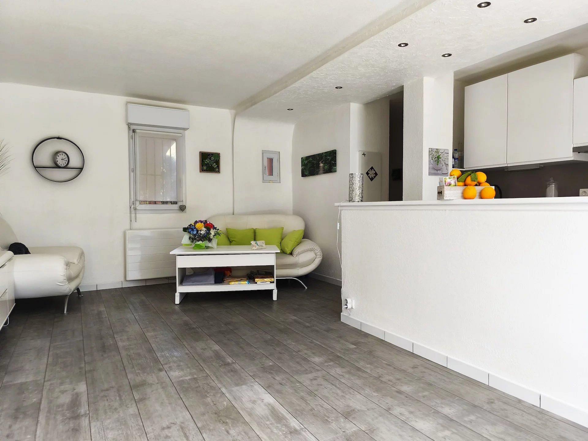 Ground-floor T3 apartment comprising an entrance hall with storage space, a fitted and equipped kitchen opening onto a living room with access to a south-facing terrace, a full suite, a second bedroom with cupboard, a shower room and toilet.
