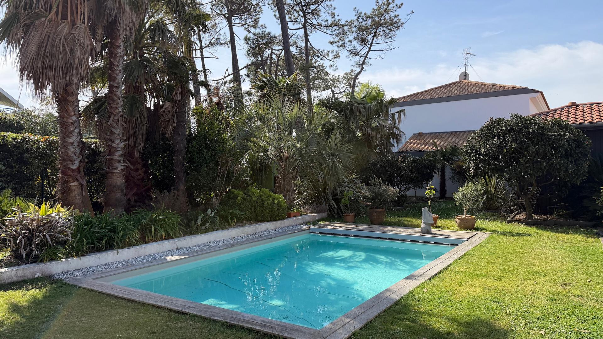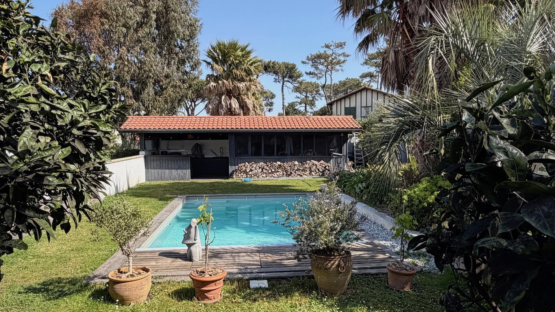 Garden with trees, heated pool protected by a security shutter, pool house with summer kitchen.