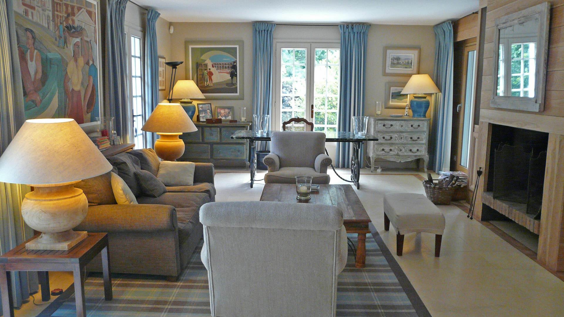Maison d’amis d’environ 250m2 Salon living, cuisine ouverte équipée et donnant sur une terrasse couverte.