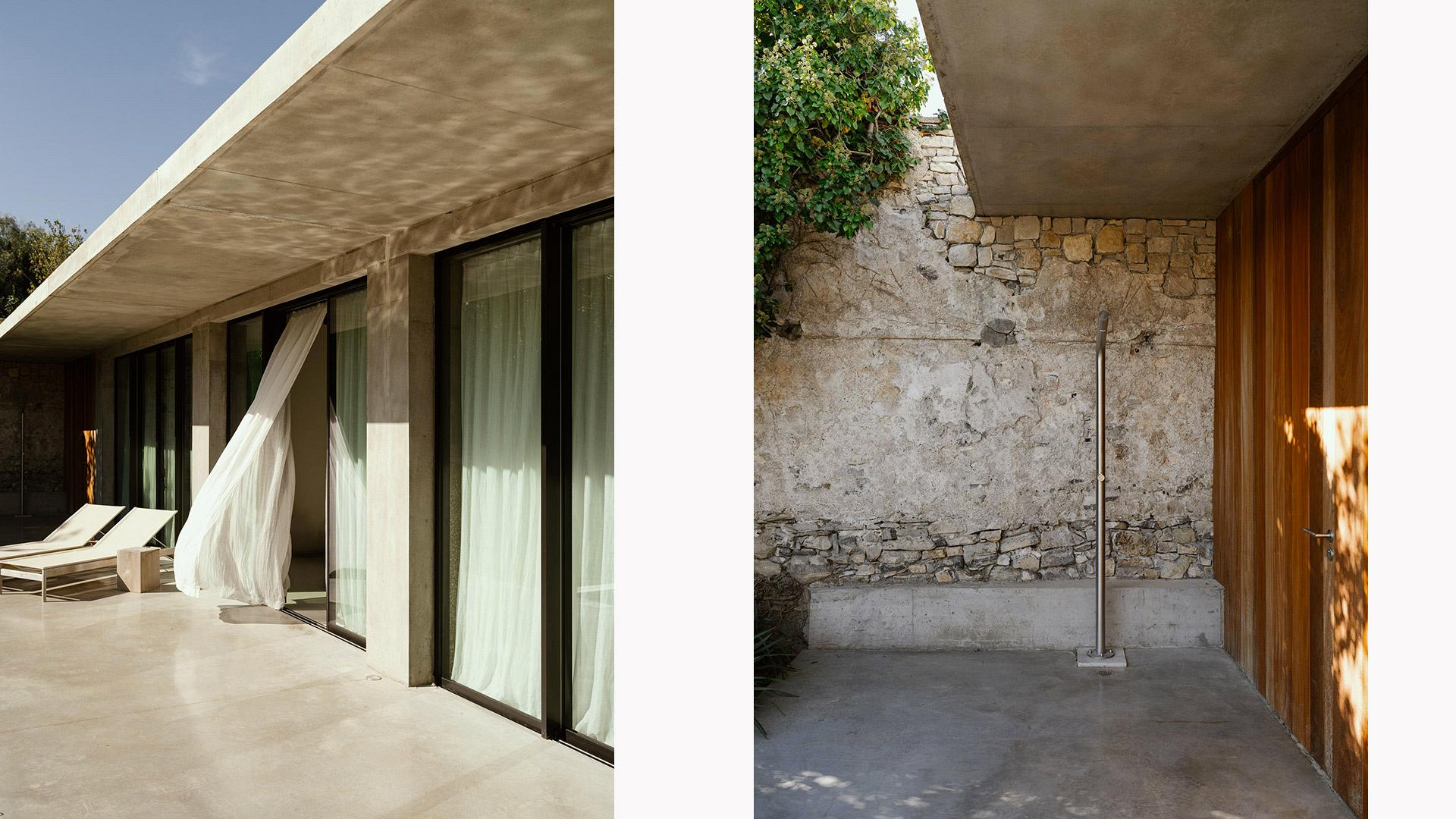 Chambre au rez-de-chaussée : vue sur la piscine et l’océan, lit 180 cm, bureau USM, placards sur mesure et fauteuil iconique Eames Lounge Chair. Salle de bain séparée avec douche à l’italienne, baignoire, WC et grande vasque en travertin.