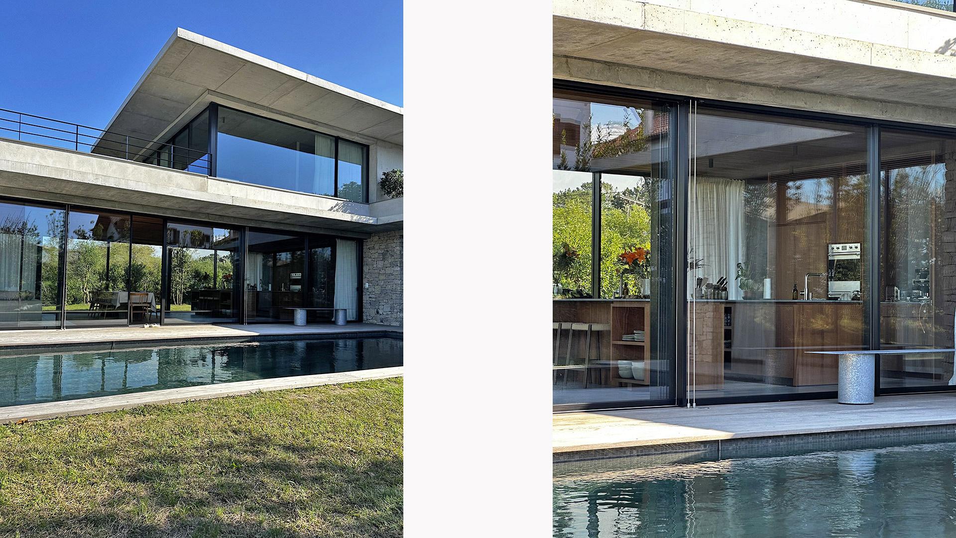 Elle s’ouvre sur un jardin paysager soigneusement aménagé et une grande terrasse équipée de mobilier extérieur Tribu et de parasols Fritz Hansen, créant un espace idéal pour profiter des journées ensoleillées.