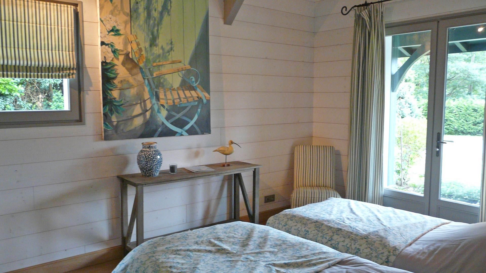 -une chambre avec deux lits simples de 90 cm modulables, pouvant être réunis ou séparés,