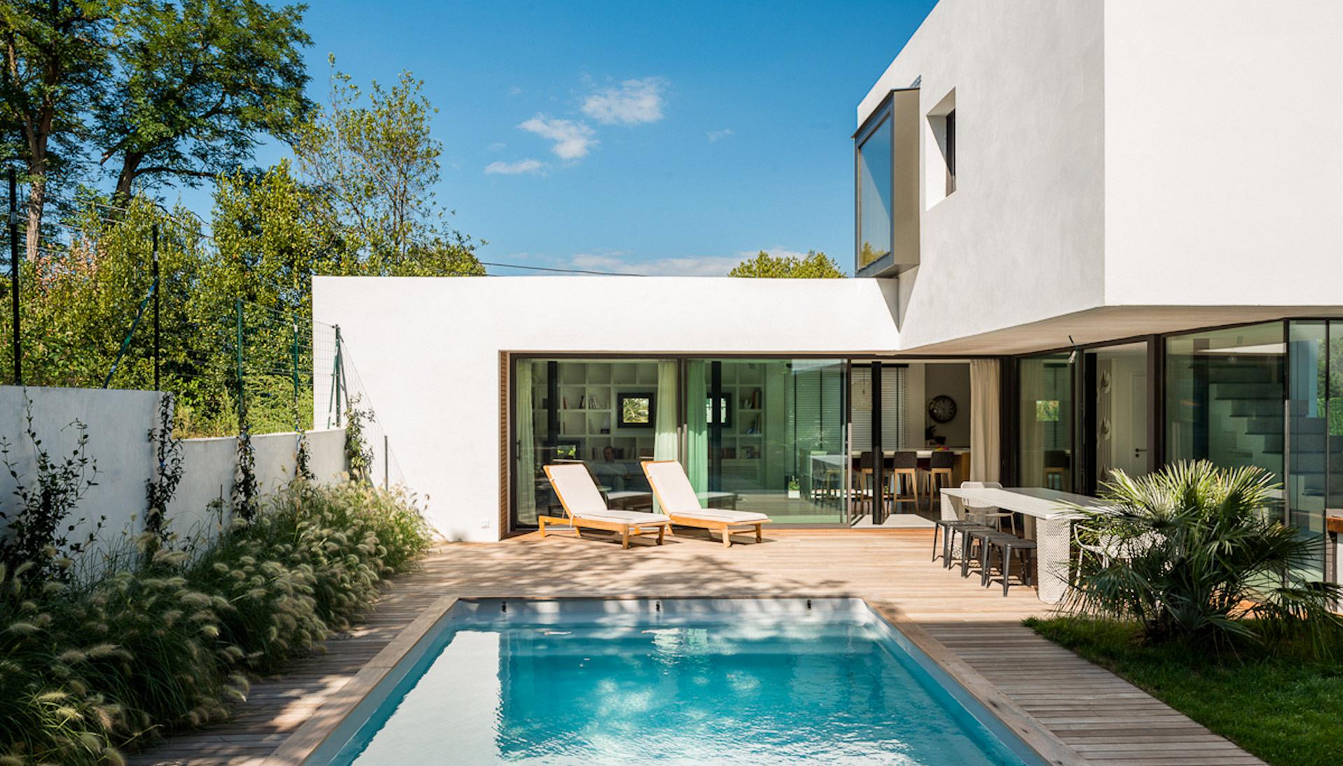 Conçue par l’atelier Delphine Carrère, la maison développe 140 m² habitables et s’ouvre sur une vaste terrasse en bois, sublimée par un espace végétalisé et une salle à manger d’été, parfaite pour les moments de convivialité.