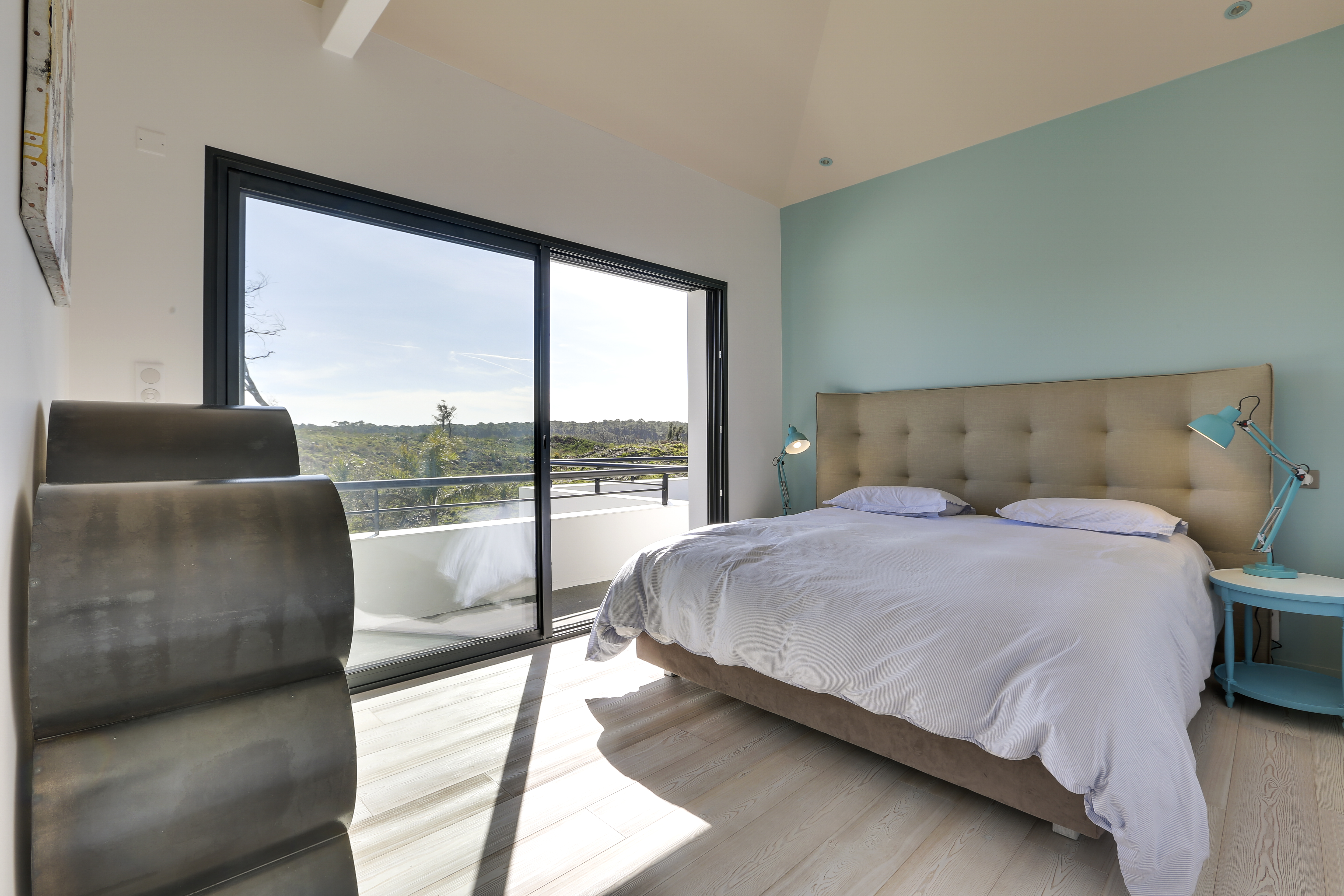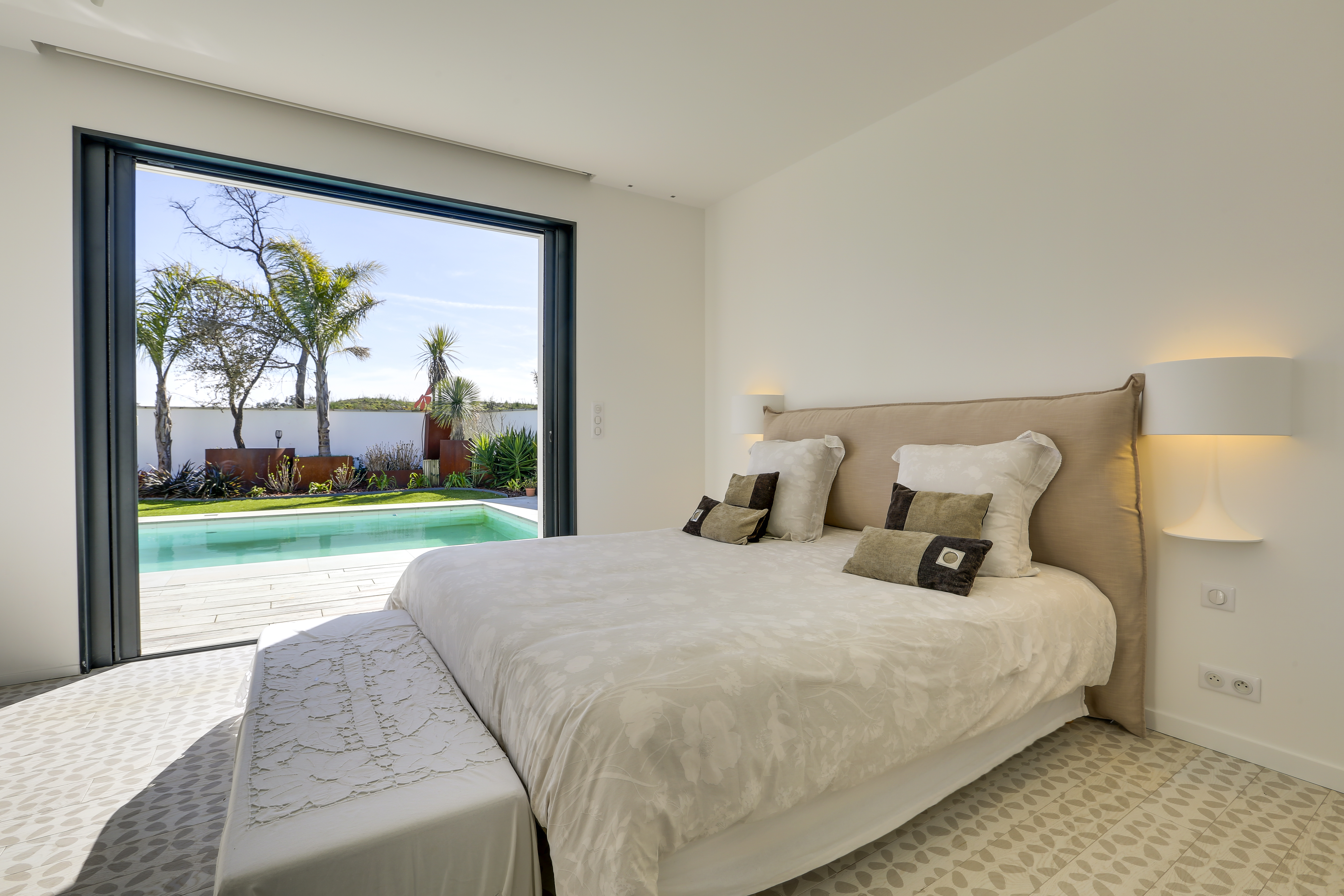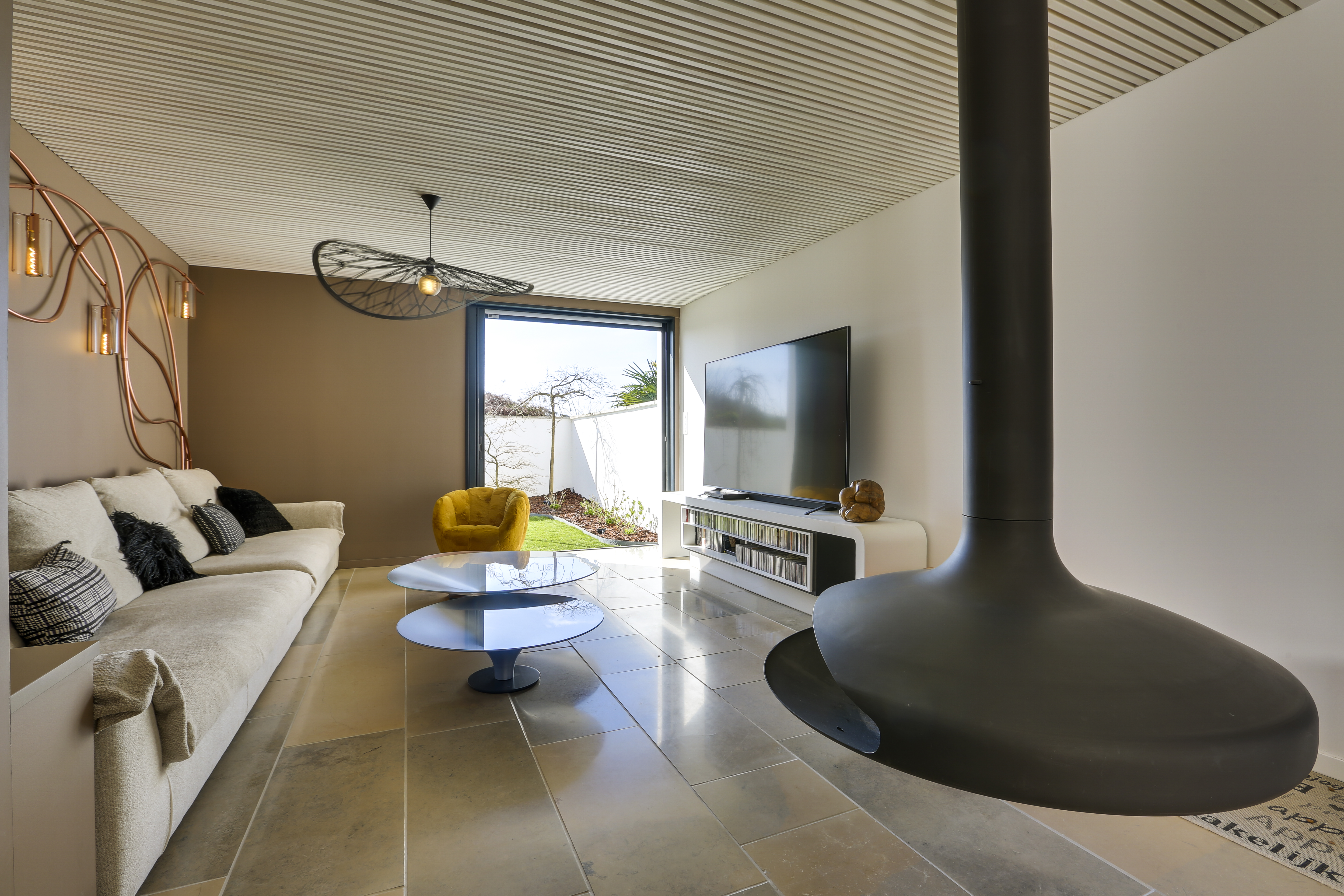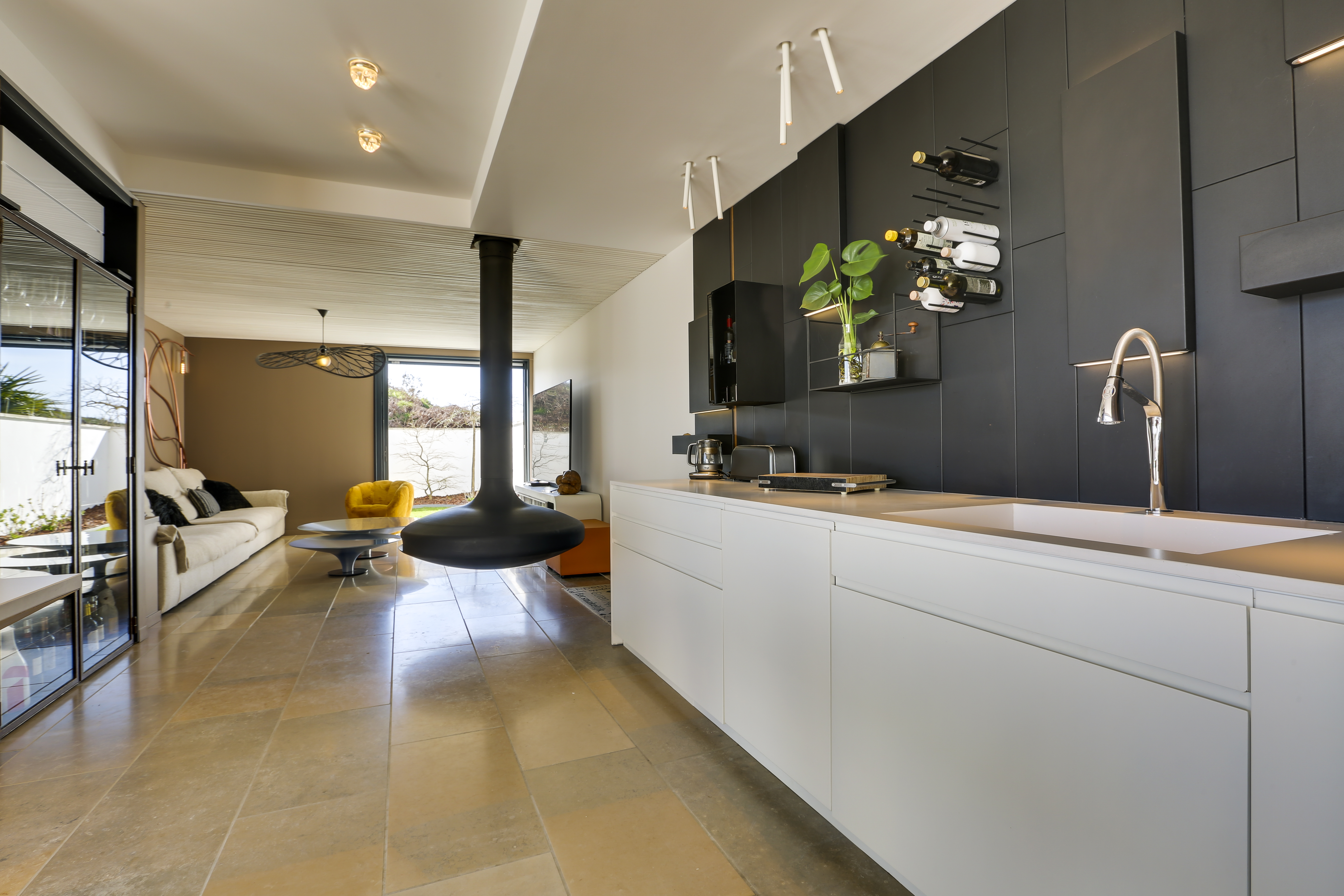 Vous apprécierez le design moderne et la qualité des équipements de la maison. L’espace salle à manger/cuisine est bordé de baies vitrées à galandages qui donnent sur la terrasse et le jardin d’une superficie totale de 550m2 exposée Sud.