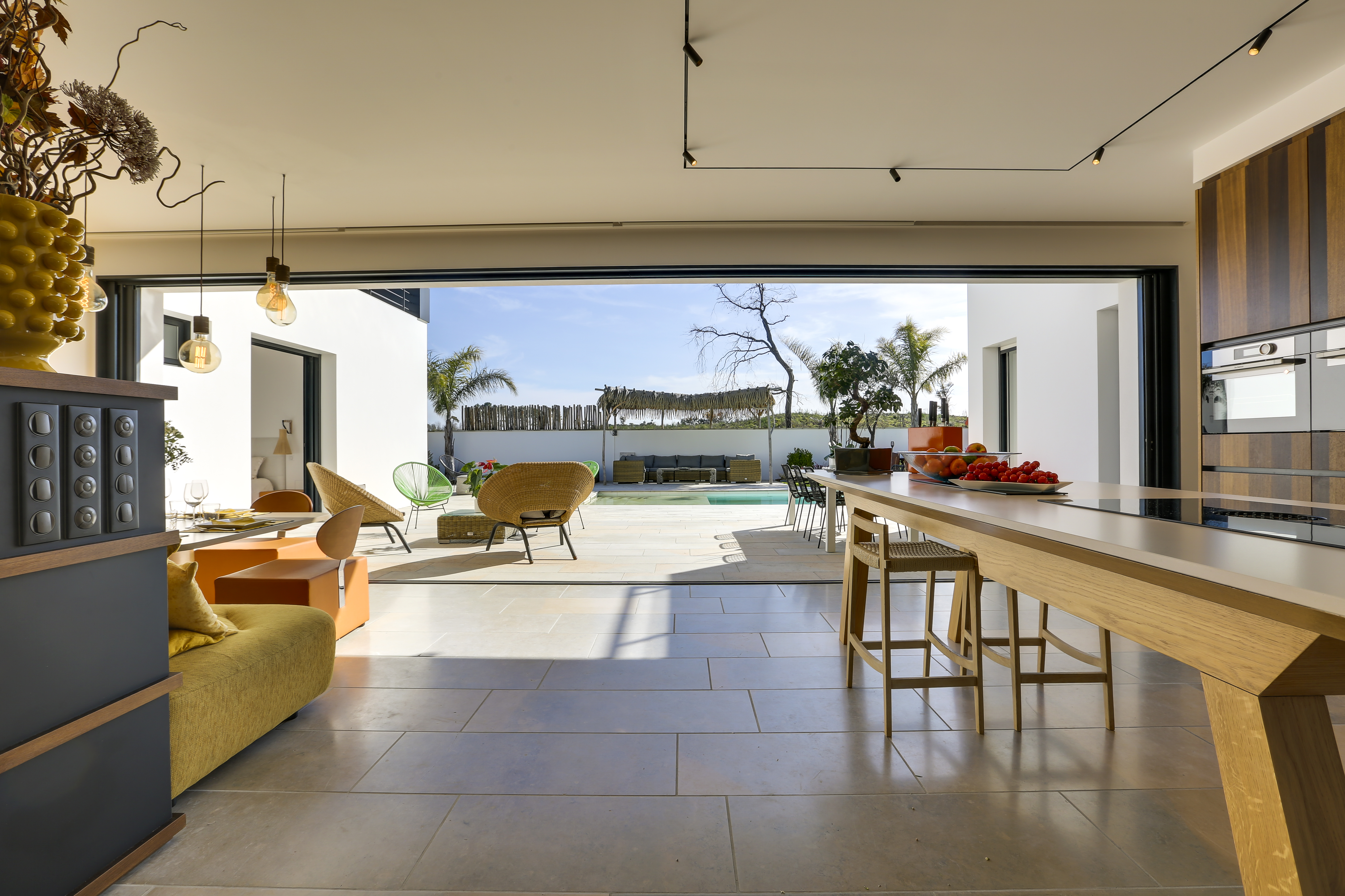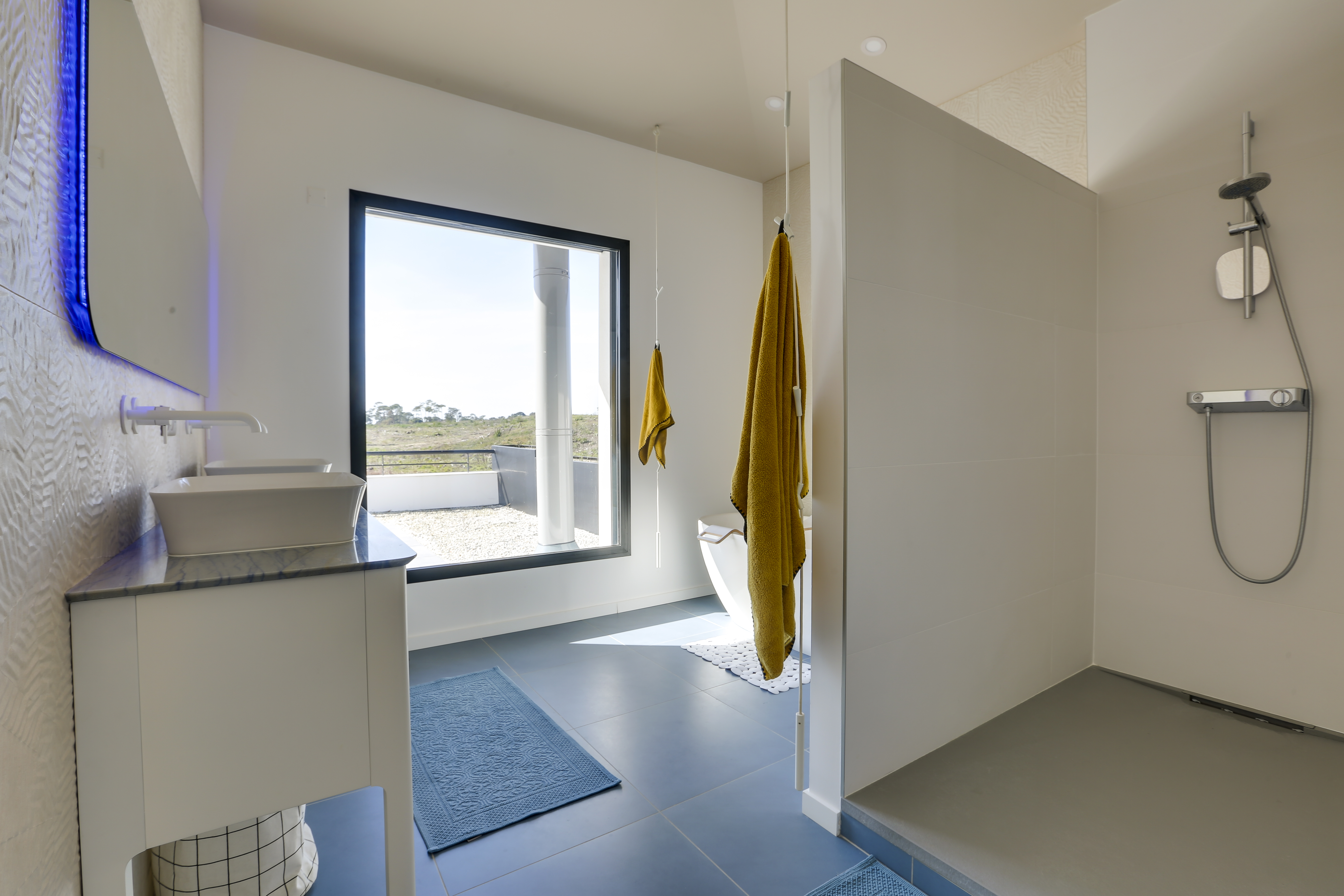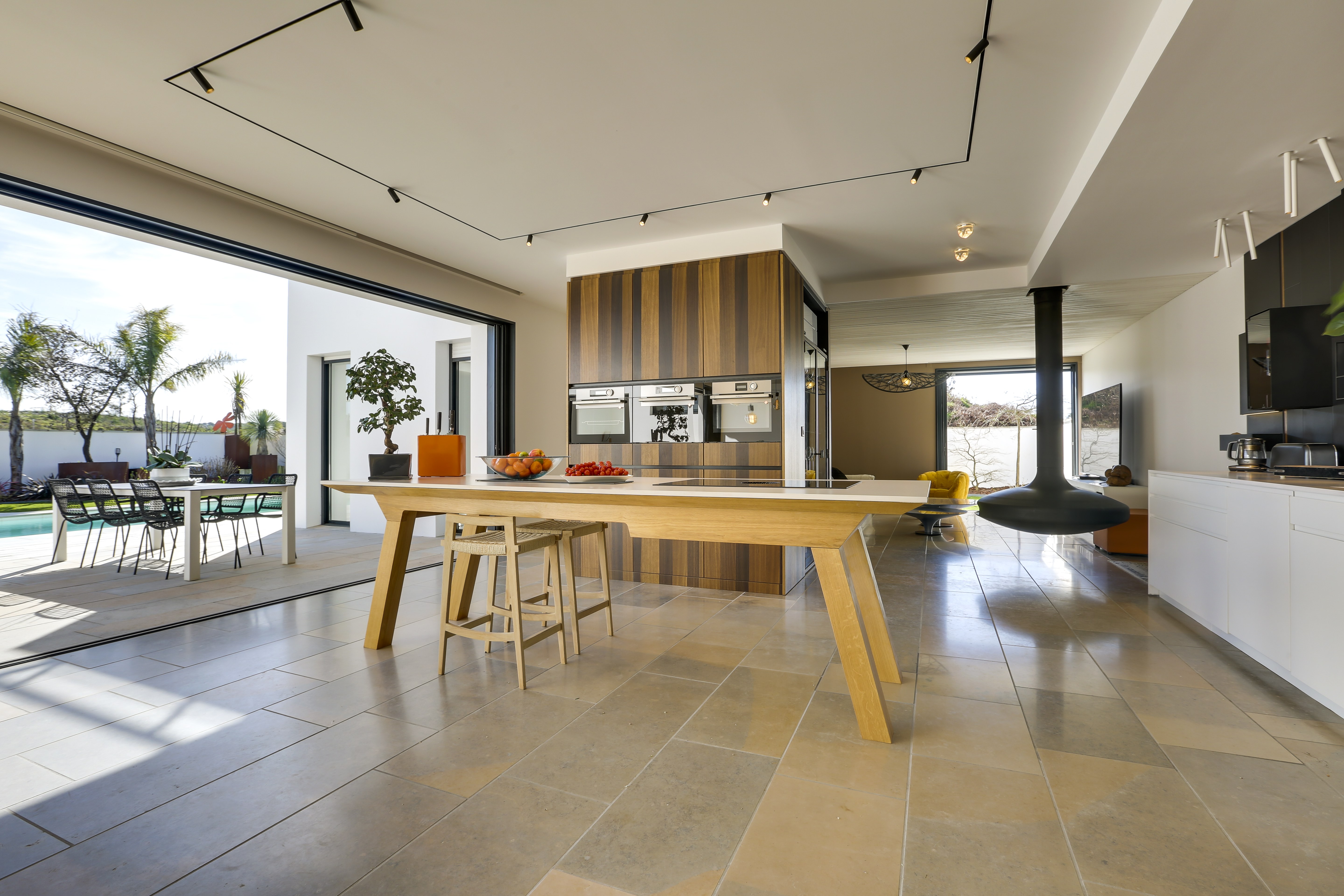 Vous apprécierez le design moderne et la qualité des équipements de la maison. L’espace salle à manger/cuisine est bordé de baies vitrées à galandages qui donnent sur la terrasse et le jardin d’une superficie totale de 550m2 exposée Sud.