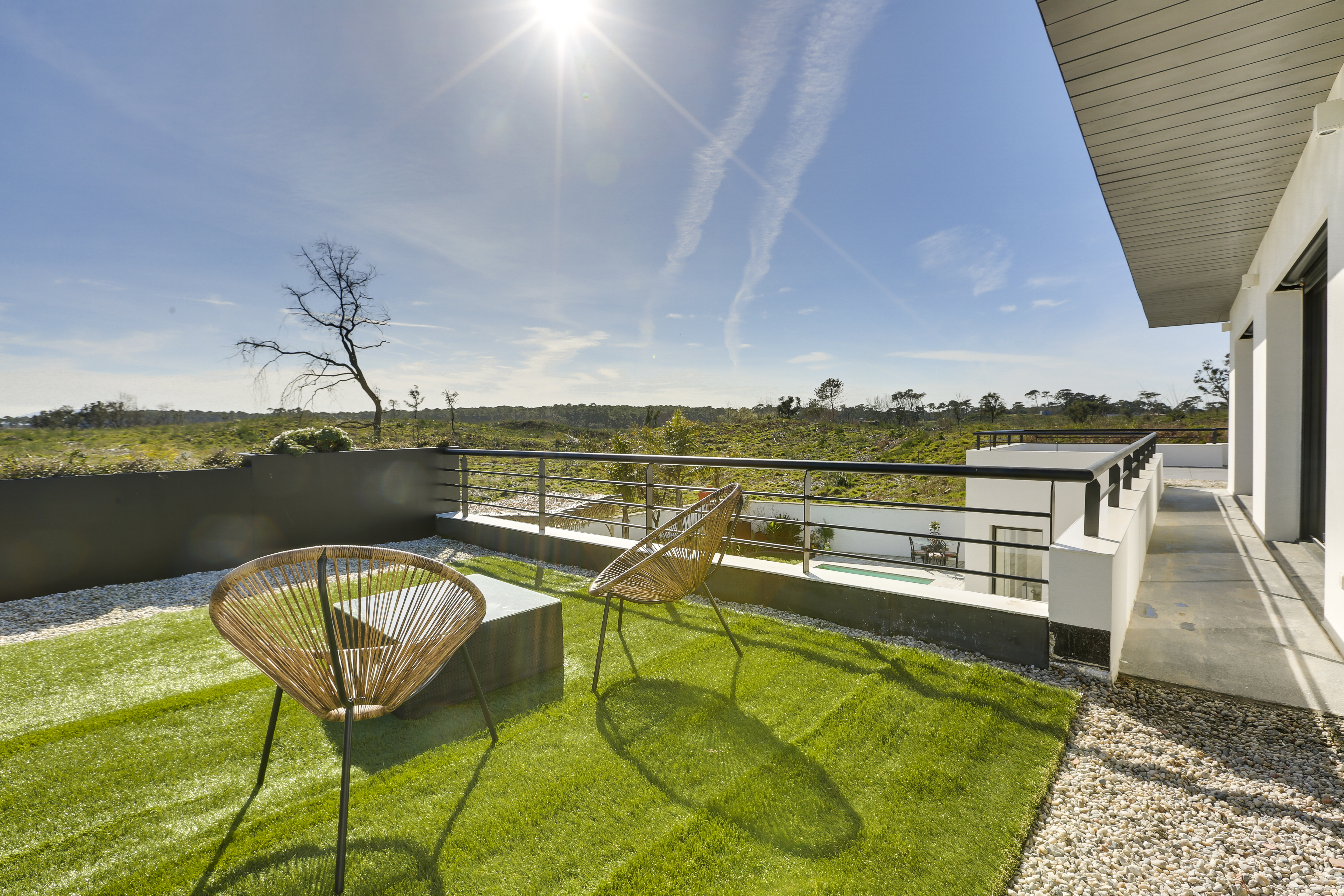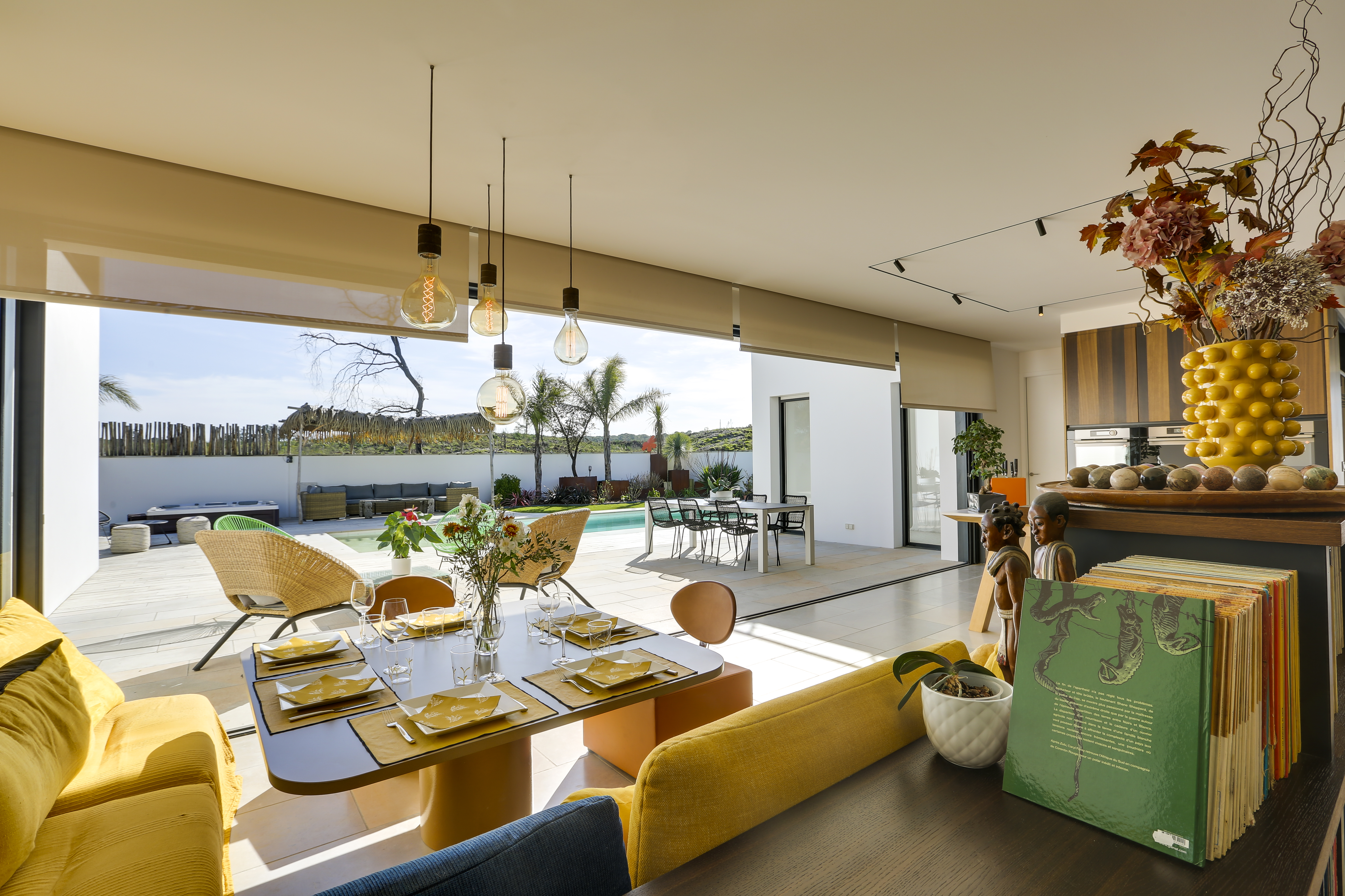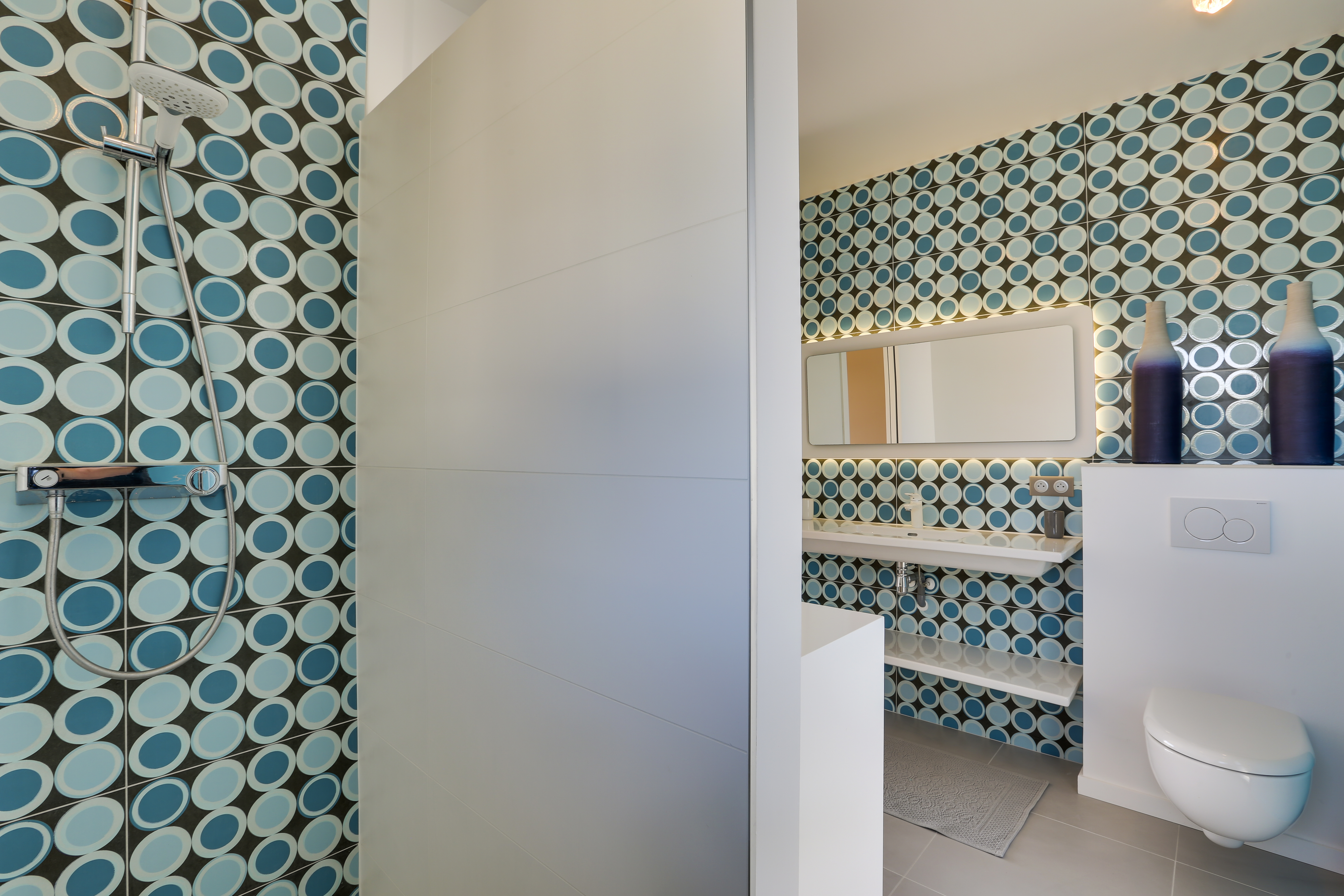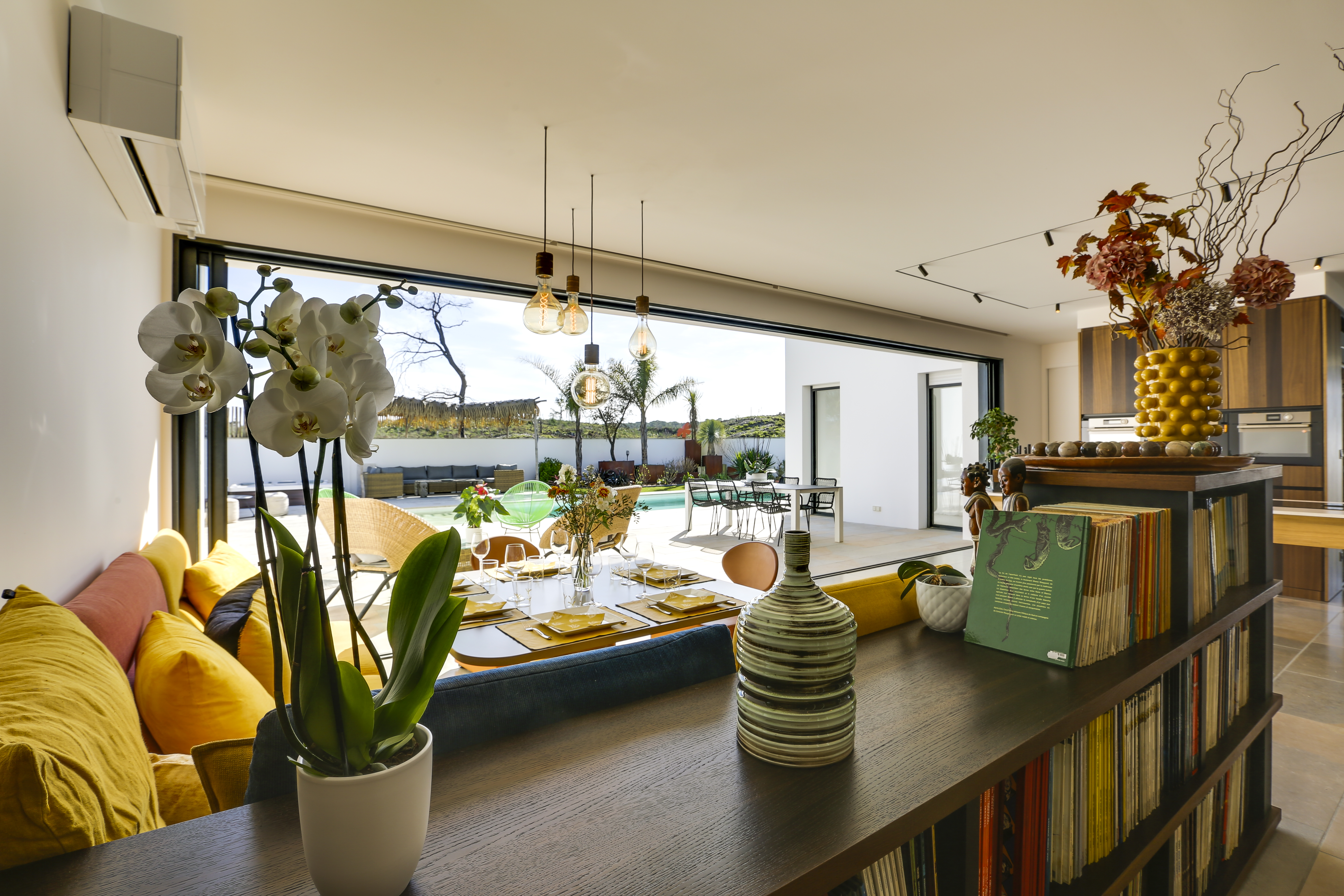 Vous apprécierez le design moderne et la qualité des équipements de la maison. L’espace salle à manger/cuisine est bordé de baies vitrées à galandages qui donnent sur la terrasse et le jardin d’une superficie totale de 550m2 exposée Sud.