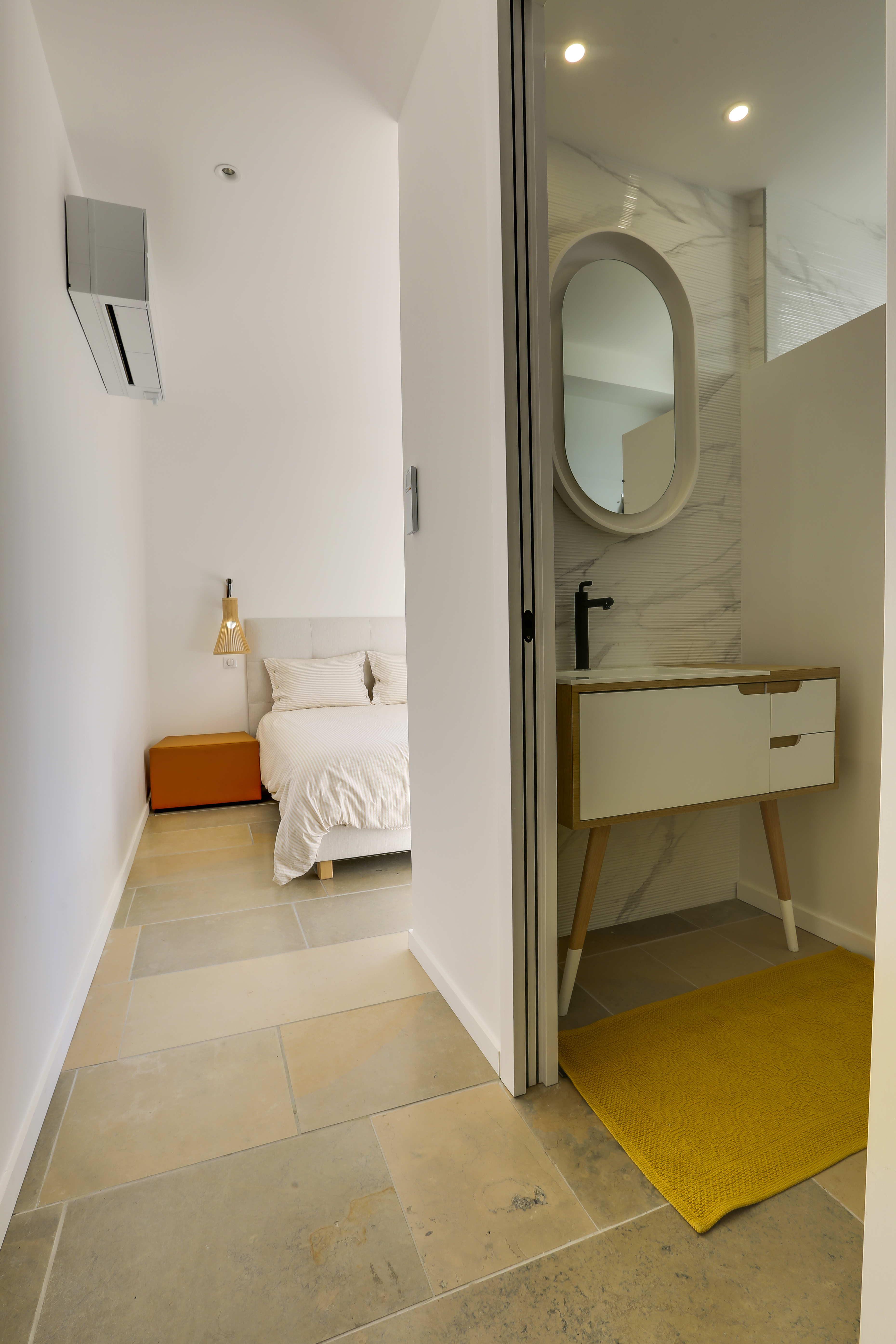 Une autre chambre ( lit 160 ) avec sa salle de douche + wc se situe sur ce même étage, disposant également d’un accès sur le toit terrasse.