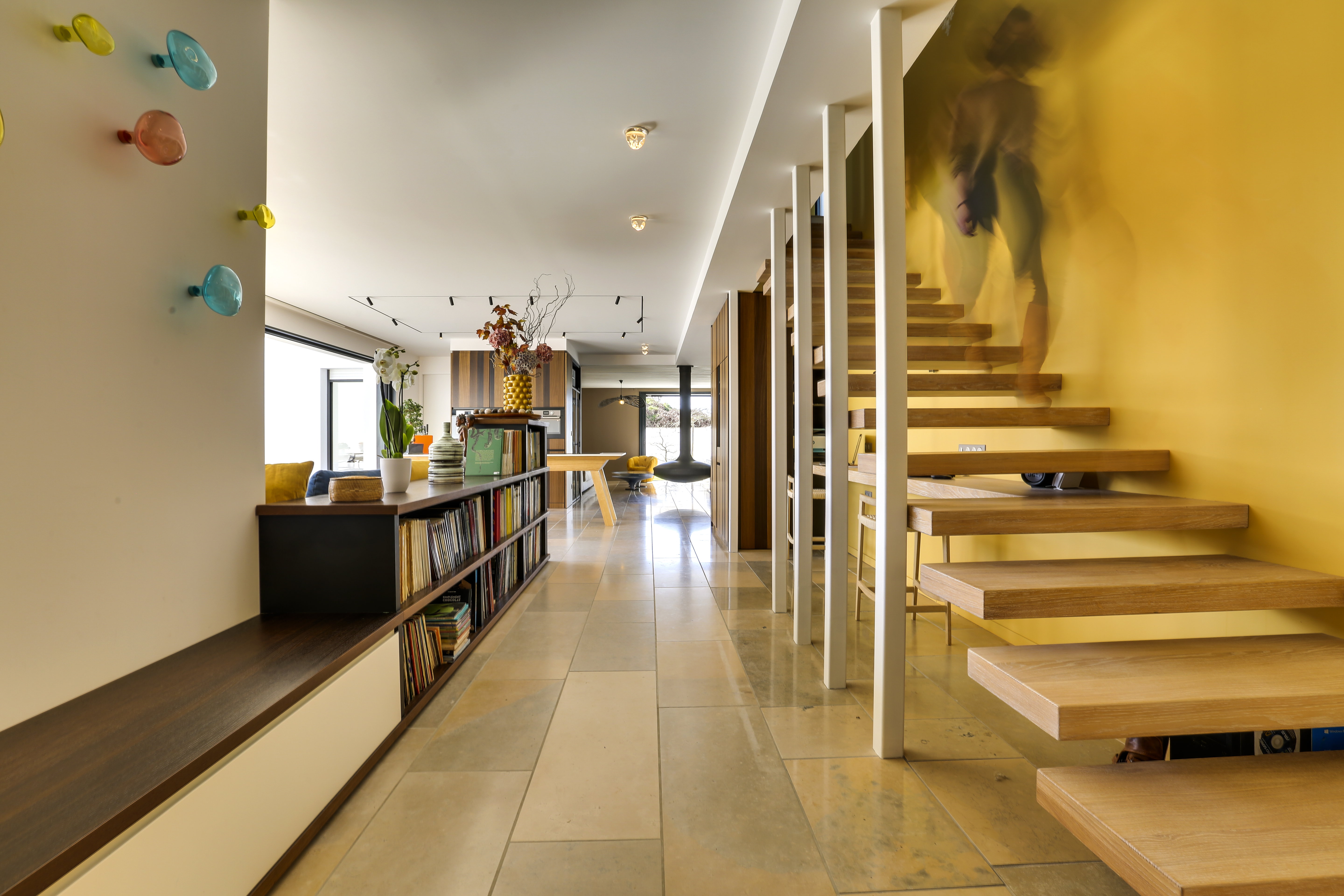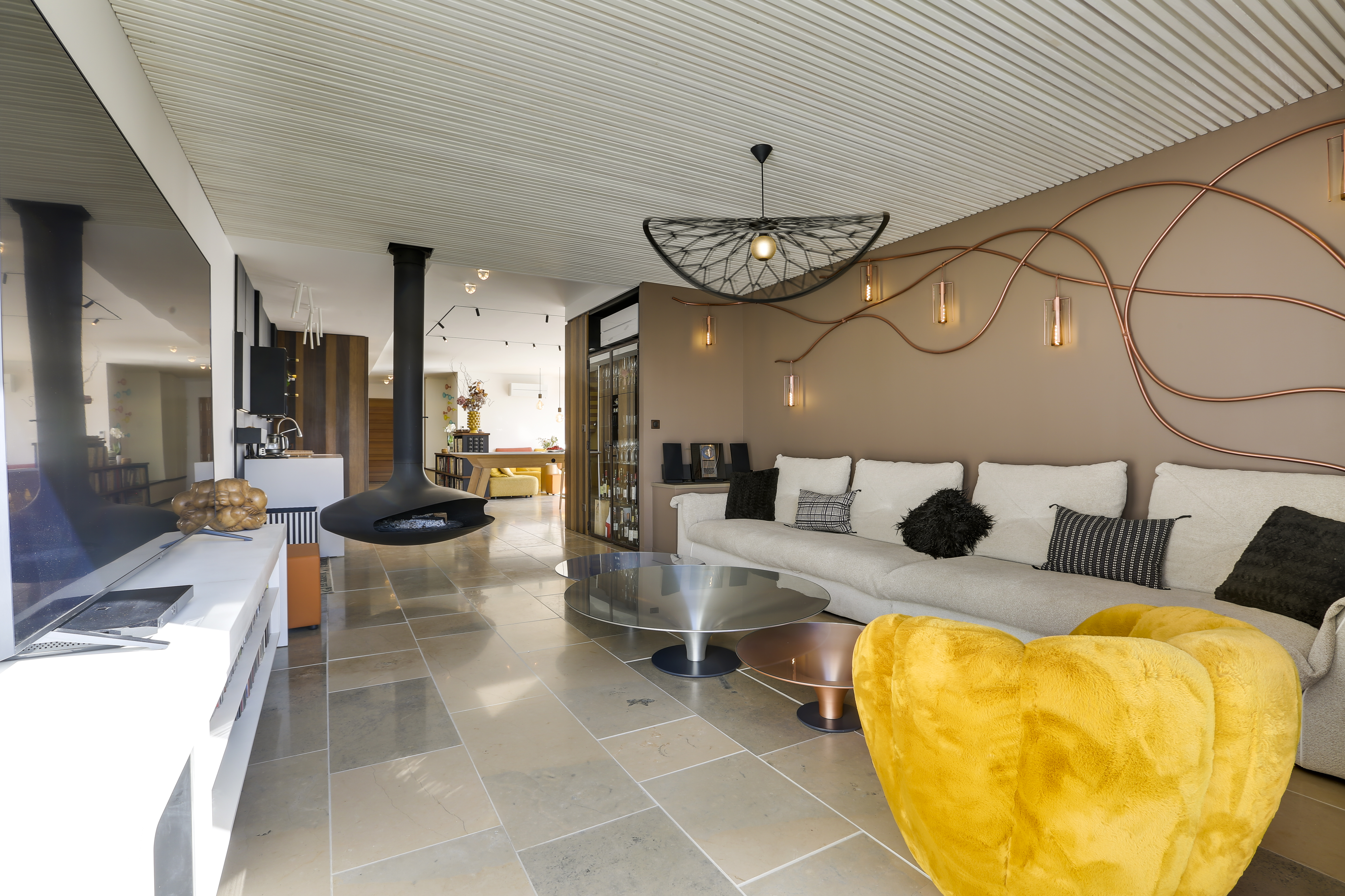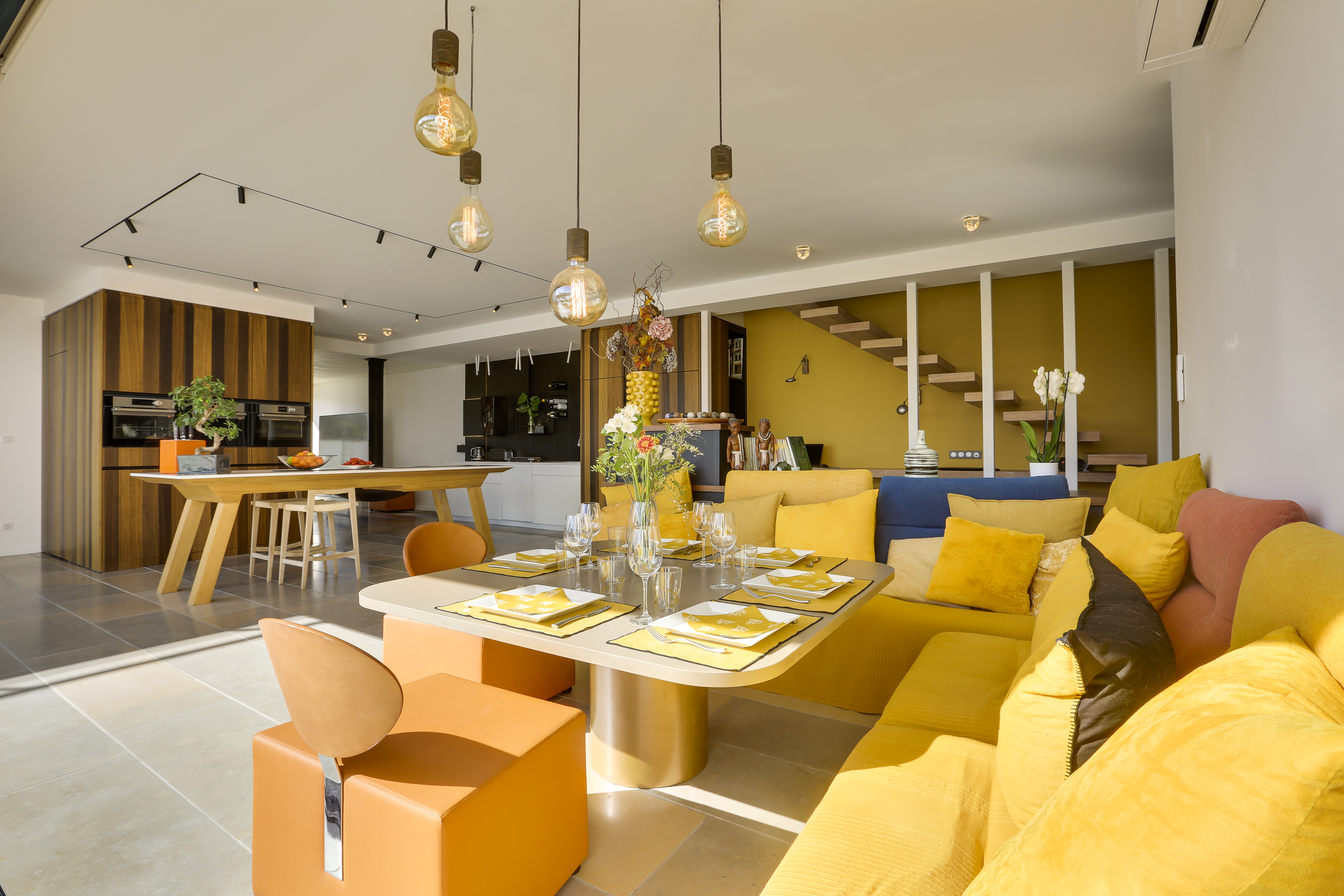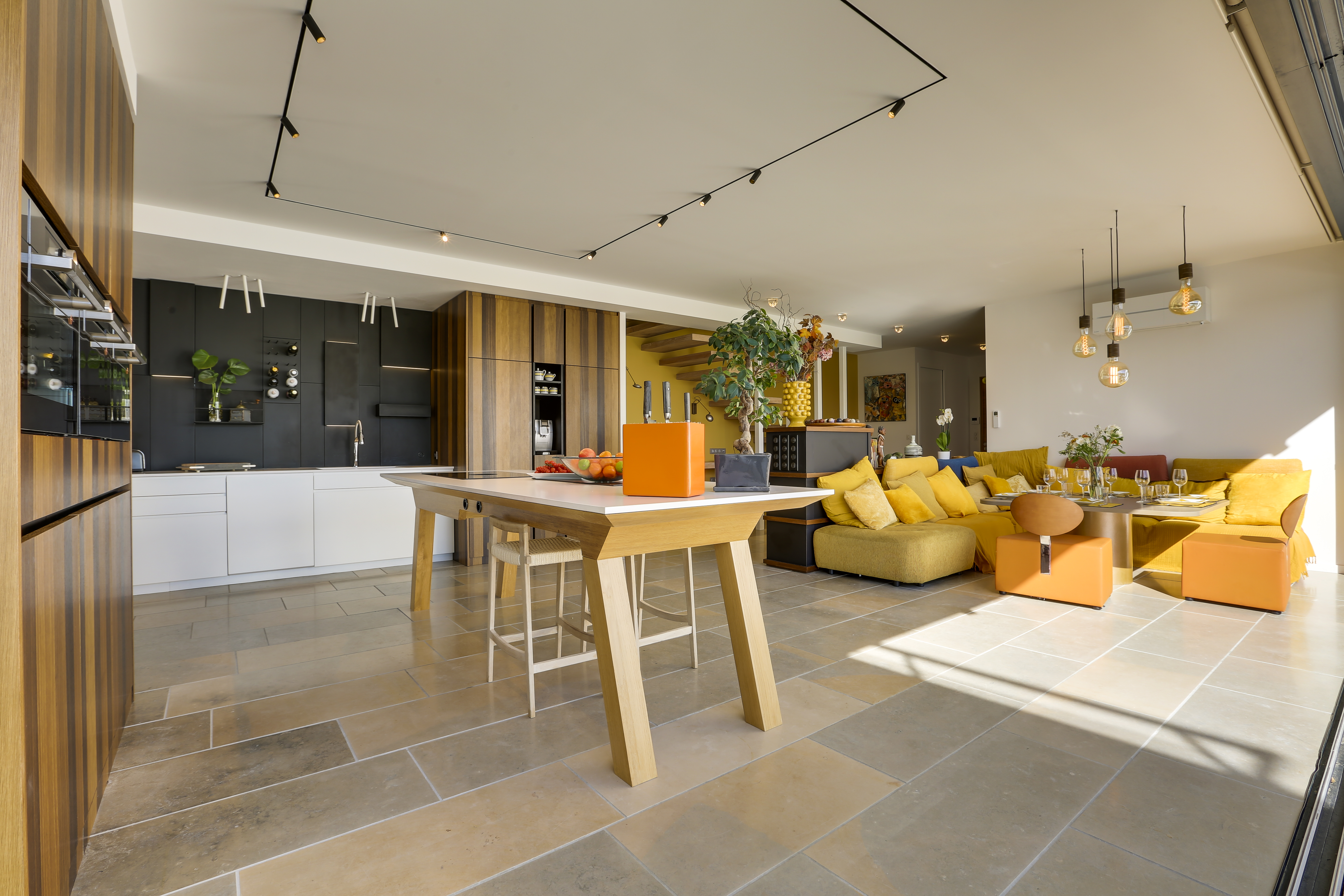 Un salon télé se situe dans la prolongation de la pièce de vie.