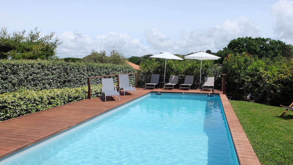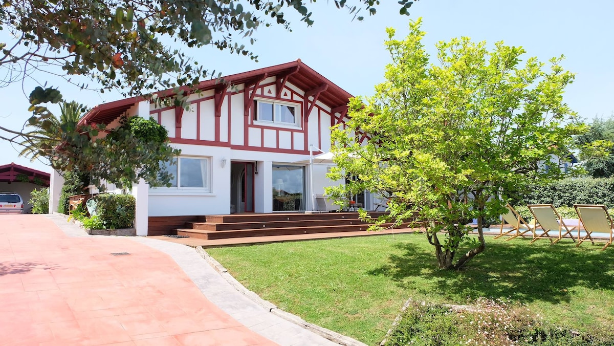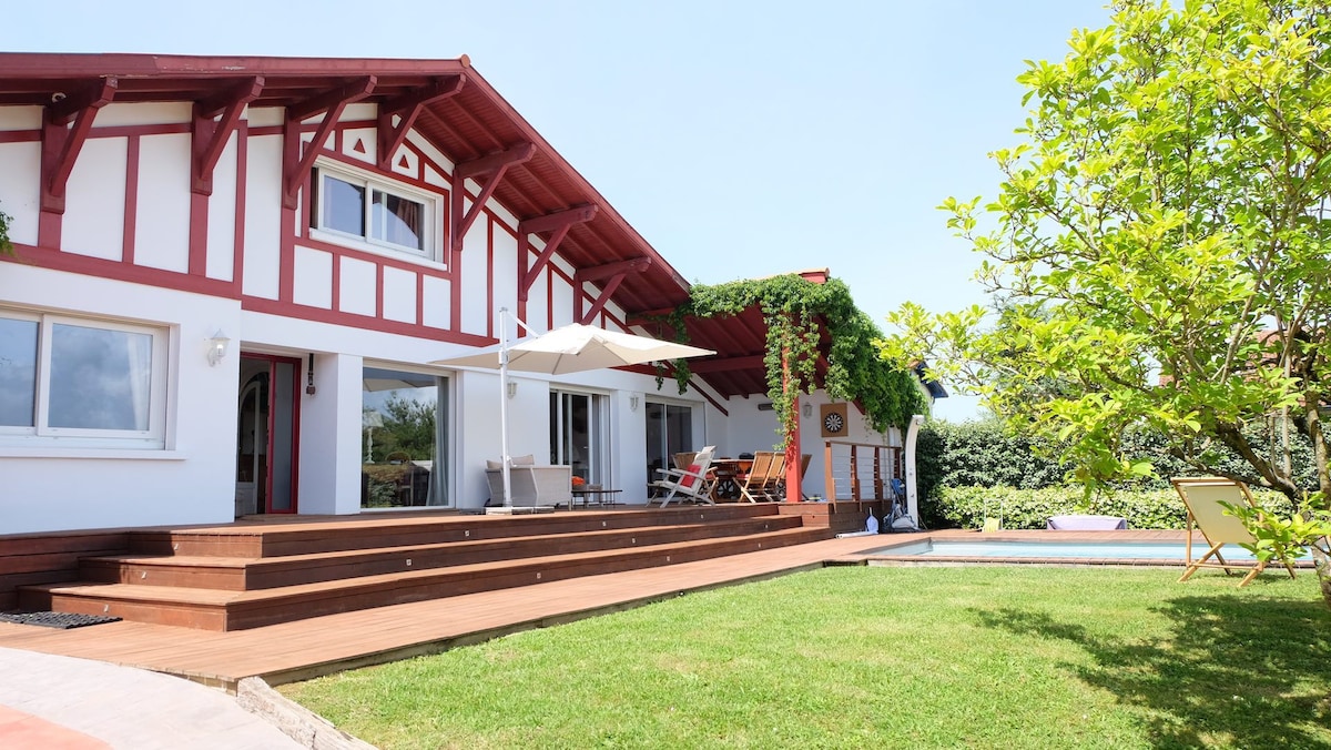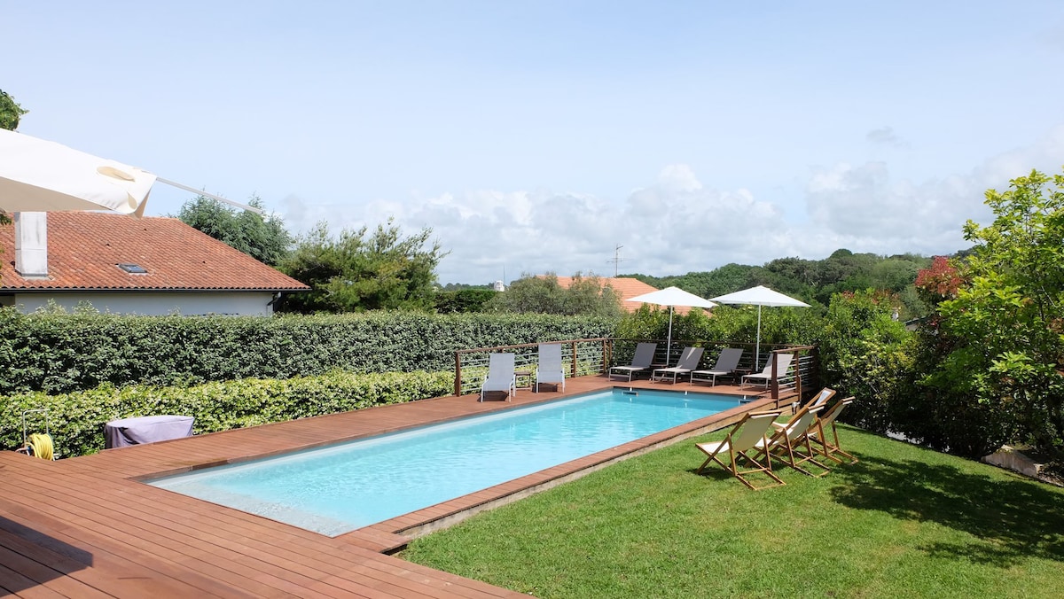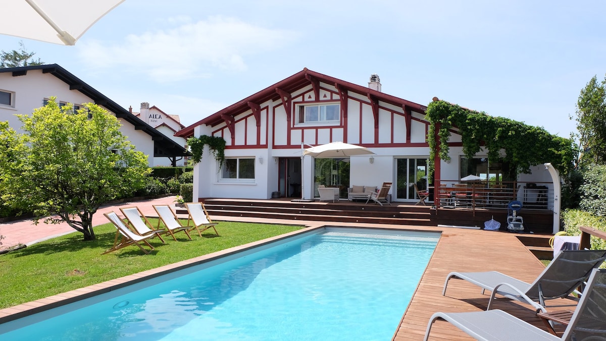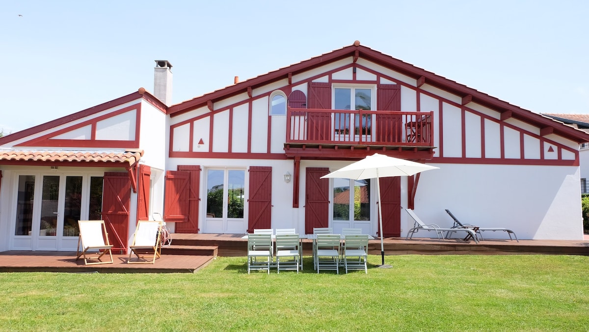 À seulement un kilomètre de l’océan, cette élégante villa de style basque de 205 m² bénéficie d’un emplacement idéal, permettant de rejoindre à pied le centre du village en une dizaine de minutes. Les premiers commerces — boulangerie et supérette — se situent à 5 minutes.
