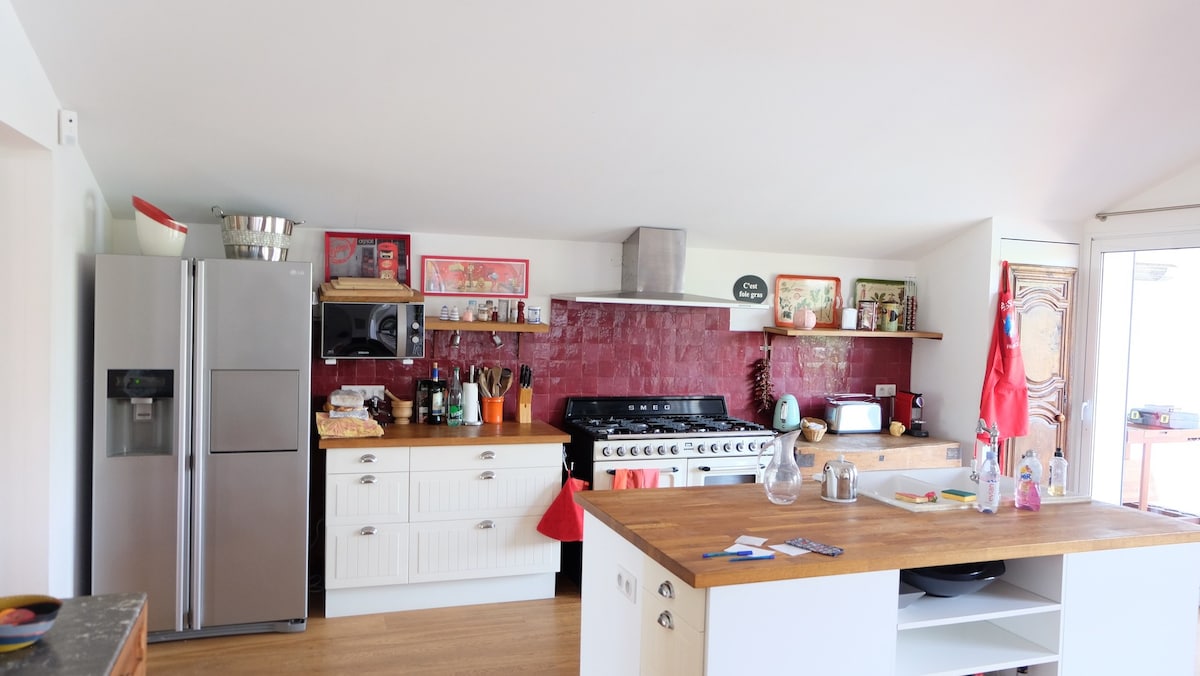 Les espaces de vie permettent à chacun de profiter de moments d’indépendance : une vaste salle à manger cathédrale climatisée s’ouvre sur une cuisine entièrement équipée (frigo américain, piano de cuisson Smeg avec trois fours et grill, mixeur, nombreux ustensiles, cafetière Nespresso).
